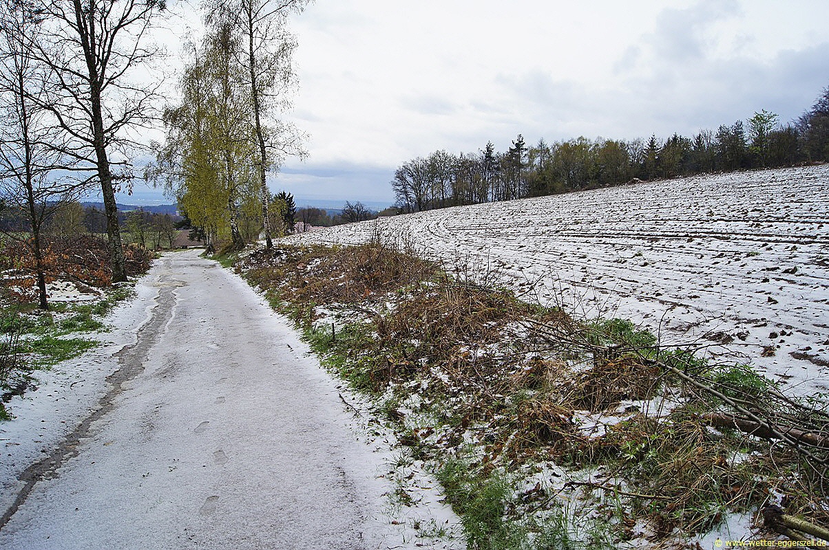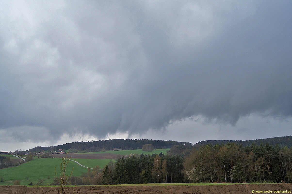 Am frühen Nachmittag zog dabei das erste Hagelgewitter über den Wetterstationsort Eggerszell von West nach Ost hinweg. Viele Schauerzellen konnten sich bei Anströmen an den Vorderen Bayerwald zu heftigen Hagelzellen mit Blitz und Donner verstärken! Das Gewitter hielt sich für gut 15-20 Minuten über Eggerszell, zunächst regnete es nur leicht bei einer Temperatur von 7,2 °C. Der Niederschlag wurde alledings rasch nach nur wenigen Minuten stärker und ging rasend schnell in Hagel über. Die Temperaturen wurden aufgrund des starken Niedeschlages rasant in den Keller getrieben. Bei Abzug des Gewitters sank die Temperatur selbst in Eggerszell auf 490 m auf 2,8 °C (vor Beginn des Gewitters gab es noch 8 Grad) ab und die Niederschläge gingen zum Ende als Schnee nieder. In Hirschberg (ca. 1 km westlich von Eggerszell) sank die Temperatur auf 630 m sogar vorübergehend unter 1 Grad Celsius ab!