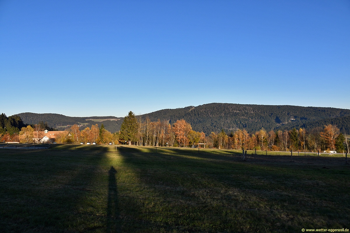 Der 09.11.2020 brachte in den tieferen Lagen unterhalb ca. 700 m Höhe ganztags teils sehr dichten Dauernebel mit Sichtweiten rund um Eggerszell durchwegs nur zwischen 50 und 100 m. Am Vormittag lagen die Sichtweiten sogar größtenteils unter 50 Meter zwischen Eggerszell, Pilgramsberg und Hötzelsdorf. Dagegen gab es oberhalb der Nebelsuppe in höheren Lagen des Bayerischen Waldes ab rund 750 m Höhe von früh bis spät strahlenden Sonnenschein aus tief-blauem Himmel. Während die Höchstwerte im Dauernebel nur zwischen 0 und 3 °C erreichten, gab es bei ganztags Sonnenschein-pur in sehr trockener Luft in den Hochlagen maximal 9 bis 13 °C. In Eggerszell gab es tagsüber bei dichtem Dauernebel maximal bis 1,4 °C. Dagegen lagen die Temperaturen auf den höchsten Bayerwaldbergen zwischen Arber-Rachel-Dreisesselberg (über 1200 m Höhe) tagsüber bei zeitweise deutlich über +10 °C, sodass es heute in und rund um Eggerszell (zwischen 500 und 650 m Höhe) zeitweise um gut 12 °C kälter war als auf den obersten Bayerwaldbergen! Während die Höchsttemperatur am Großen Arber (1436 m) bis zu 12,6 °C erreichte, gab es in Eggerszell nur maximal 1,4 °C zu verzeichnen. Noch kälter war es an den umliegenden Höhenzügen bei Eggerszell zwischen 550 und 700 m Höhe. Dort konnte tagsüber sogar örtlich leichter Dauerfrost verzeichnet werden. Gegen Mittag waren die Bäume am 624 m hohen Pilgramsberg z.B. noch mit Raureif verziert, was für frühwinterliche Stimmungen sorgte. Es gab somit am 09. November 2020 massive Wetter- und Temperaturkontraste innerhalb Ostbayerns und dem Bayerischen Wald. Es herrschte eine umgekehrte Welt mit sehr milden Bergen und kalten nebligen Niederungen. Nur wenige Höhenmeter trennten zwei total unterschiedliche Wetterwelten voneinander.