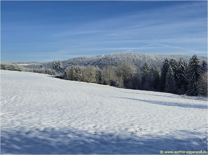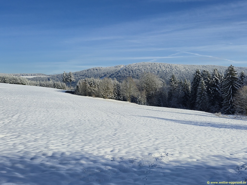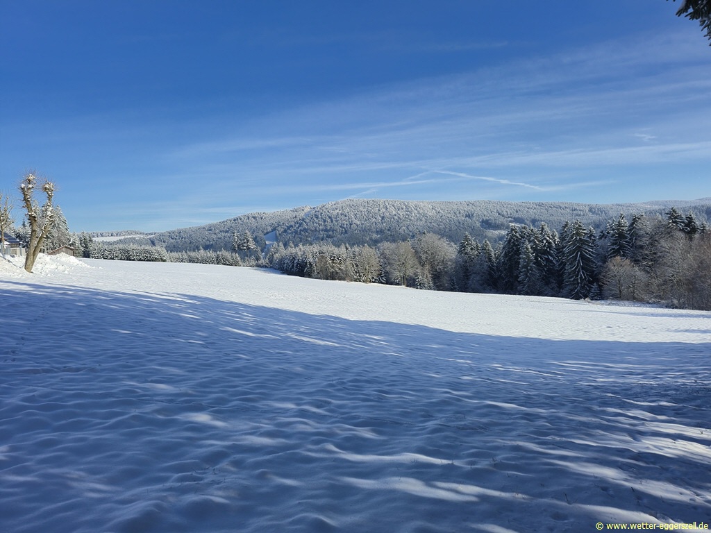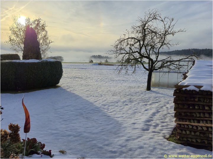 Frühwinterwetter in Eggerszell bei 8 cm Schnee, im Hintergrund sieht man das Nebelmeer. Der Ort Eggerszell lag zu diesem Zeitpunkt knapp über der Nebelsuppe: