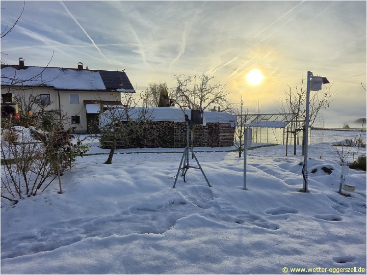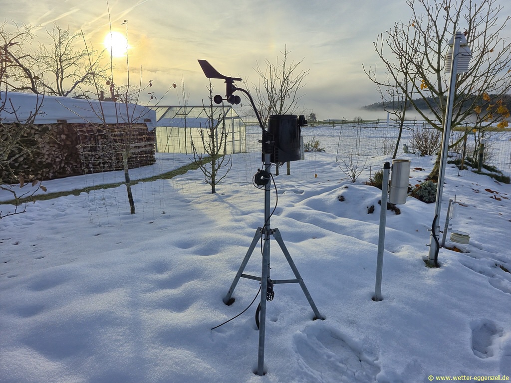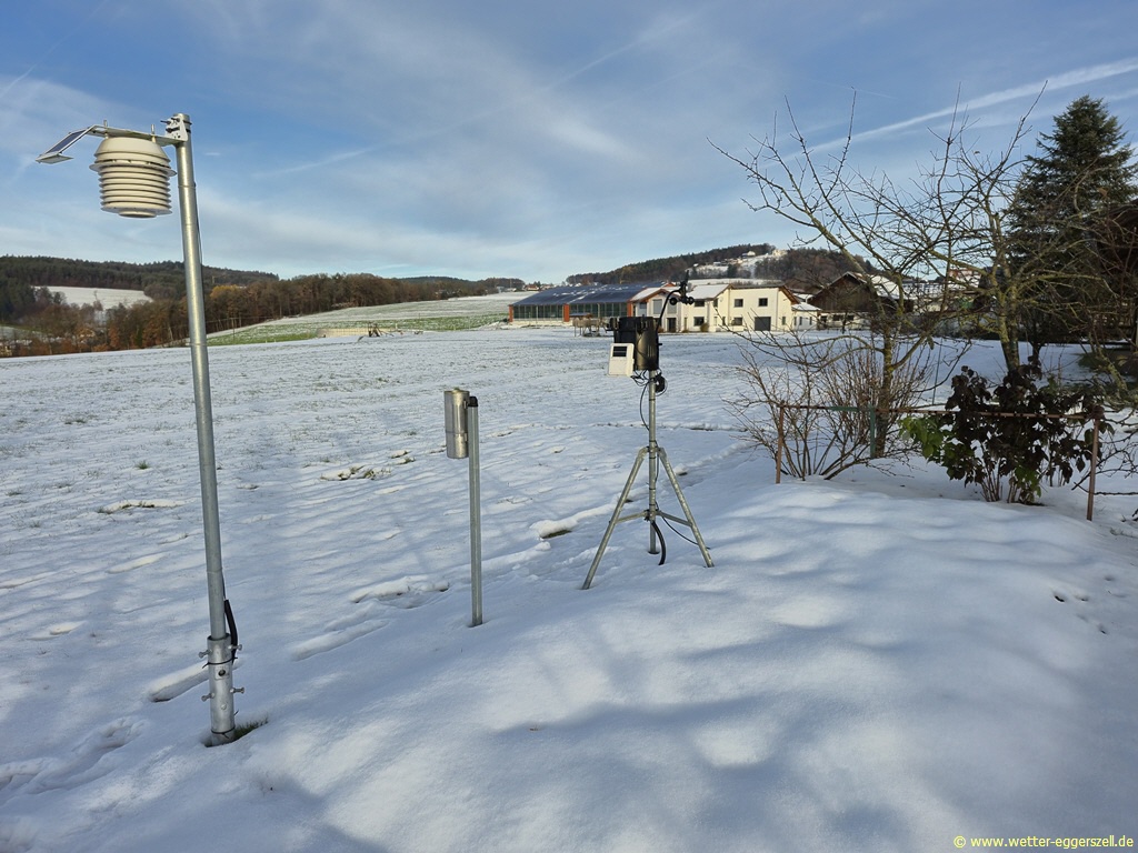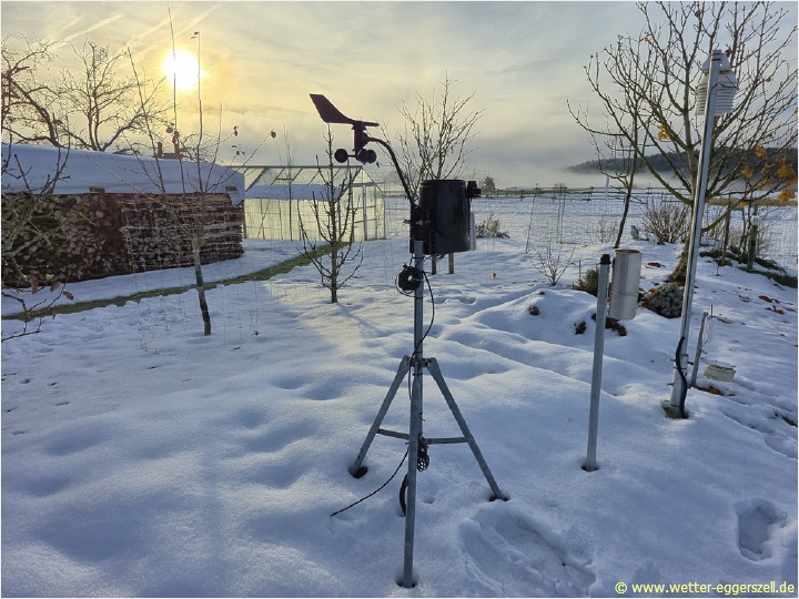 Hier haben wir das Messfeld der Wetterstation Eggerszell mit den Wettersensoren. Das Foto wurde am Vormittag des 30. November 2025 bei sonnigem Frühwinterwetter und 8 cm Schneehöhe aufgenommen. Im Hintergrund erhebt sich der 624 m hohe Pilgramsberg mit Wallfahrtskirche St. Ursula:
