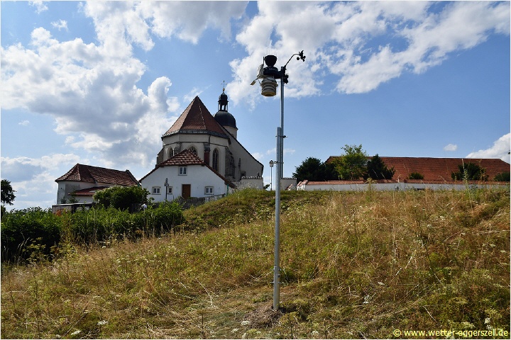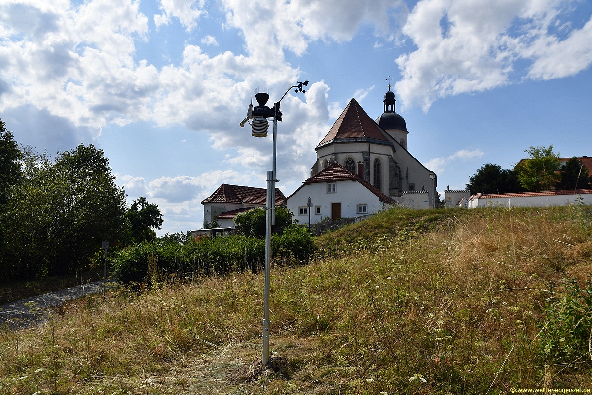 Blick von Osten her über das Messfeld und die Wettersensoren der Wetterstation Bogenberg. Direkt im Hintergrund steht die älteste Marienwallfahrtskirche Bayerns: