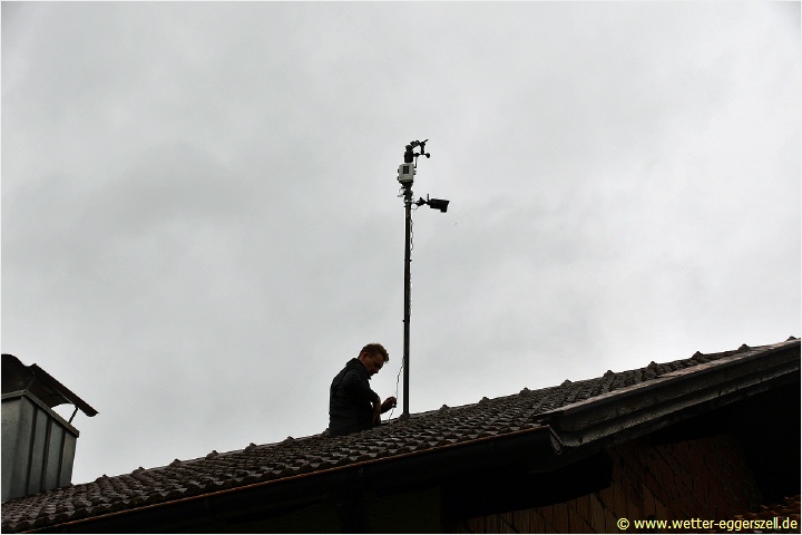 Der Windmast mit Anemometer (Windmesser) auf dem Hausdach, sodass eine Windmessung in ca. 10 Meter über dem Erdboden sichergestellt ist. Auch die Wetterwebcam ist dort am Mast befestigt und zeigt den Blick nach Nordosten über die schöne Landschaft des südlichen Bayerwaldes nördlich von Passau: