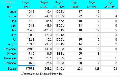 Hier finden Sie eine ausführliche Auflistung aller Wetterdaten des Jahres 2024 von der Privaten Wetterstation Sankt Englmar-Hinterwies.
