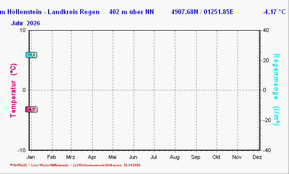 Am 02.12.2021 wurde mit der Wetterdatenaufzeichnung am Höllensteinsee (Kraftwerk am Höllenstein) begonnen. Die Wetterstation misst seitdem rund um die Uhr die Lufttemperatur, die Luftfeuchte, den Niederschlag und den Wind. Die Wetterstation wird in Zusammenarbeit mit Siegi Macht (Betreiber des Höllenstein-Kraftwerks) und Martin Bohmann (Wettermessnetz Ostbayern) betrieben. Der Deutsche Wetterdienst (DWD) hat am exakt gleichen Standort zwischen den Jahren 1941 und 2006 eine amtliche Station betrieben. Die Aufzeichnung wurde seitens des DWD im Verlauf des Jahres 2006 eingestellt. Nach rund 15 Jahren Aufzeichnungs-Pause wurde im Dezember 2021 durch das Wettermessnetz Ostbayern wieder mit der Aufzeichnung begonnen. Es besteht somit bereits eine 67-jährige Messreihe am Standort Höllenstein/Kraftwerk und man kann auf Archivwerte zurückgreifen. [Weitere Informationen zum Standort finden Sie hier!]