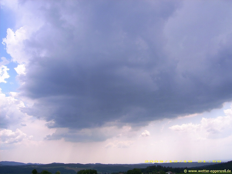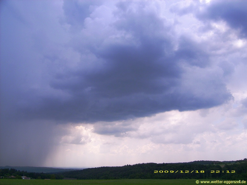 Der Tag fing bereits warm und ziemlich schwül an, optimale Bedingungen für Gewittergüsse. So sollte es dann auch kommen, denn rasch bildeten sich nachmittags mächtige Quellwolken, welche über der Stadt Bogen im Gäuboden eine kräftige Gewitterzelle entstehen lies. Die Zelle die fast stationär über Bogen stehen blieb brachte für fast eine Stunde extremen Platzregen und kleinkörnigen Hagel. Von Eggerszell aus hatte man die gesamte Zelle schön im Blick, besonders schön war die Gewitterfallböe (Downburst) der Zelle zu sehen und der gut organisierte Aufwindbereich. Was mich allerdings am meisten beeindruckte waren die massiven Erdblitzentladungen! Obwohl die Zelle ca. 20 km entfernt war, hörte man das sehr dumpf klingende Donnergrollen noch außergewöhnlich laut!