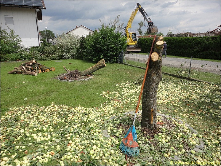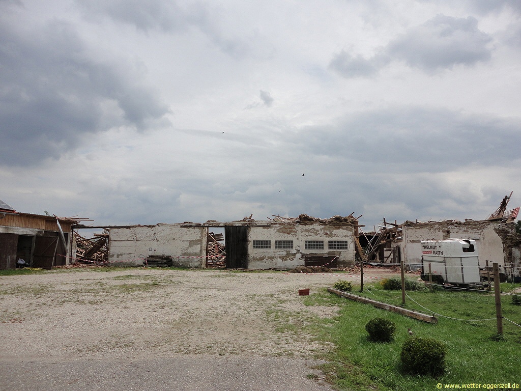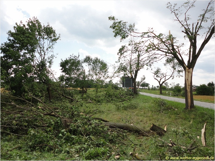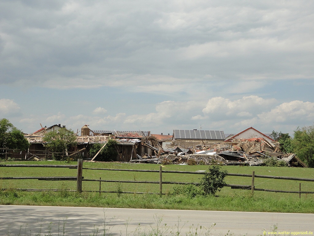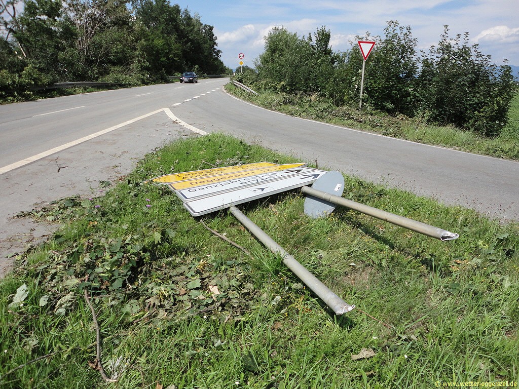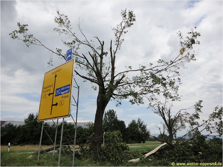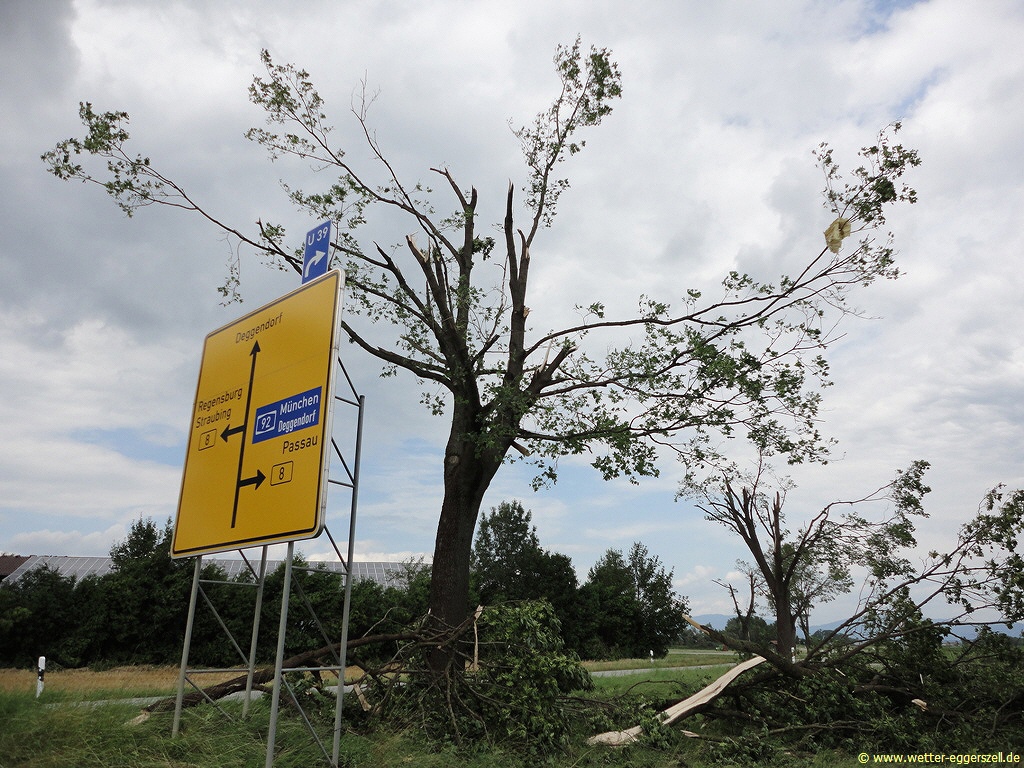 Der Gewittersturm fegte mit einer unheimlichen Gewalt durch Niederbayern! Das Ausmaß der Schäden wurde erst in den darauf folgenden Tagen richtig sichtbar. Zwischen Haidlfing, Plattling und Stephansposching gab es verbreitet teils extreme Orkanschäden (viele abgetrennte stabile Verkehrsschilder oder große umgedrückte Strommasten), welche alle eindeutig als Downburstschäden (normale Schäden aufgrund eines heftigen Sturmes) eingeordnet werden konnten.