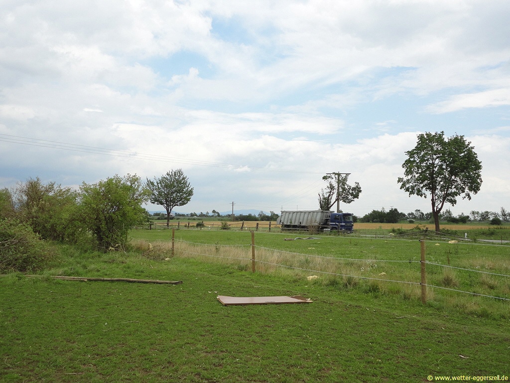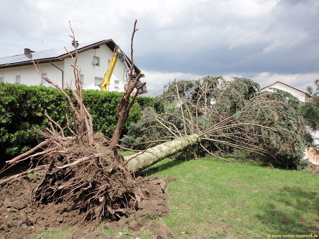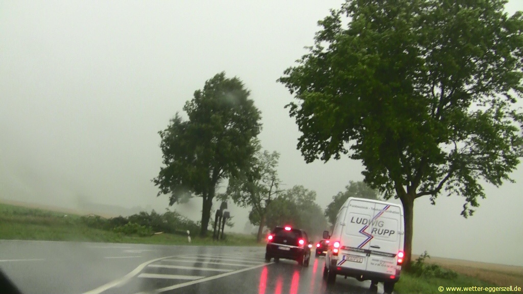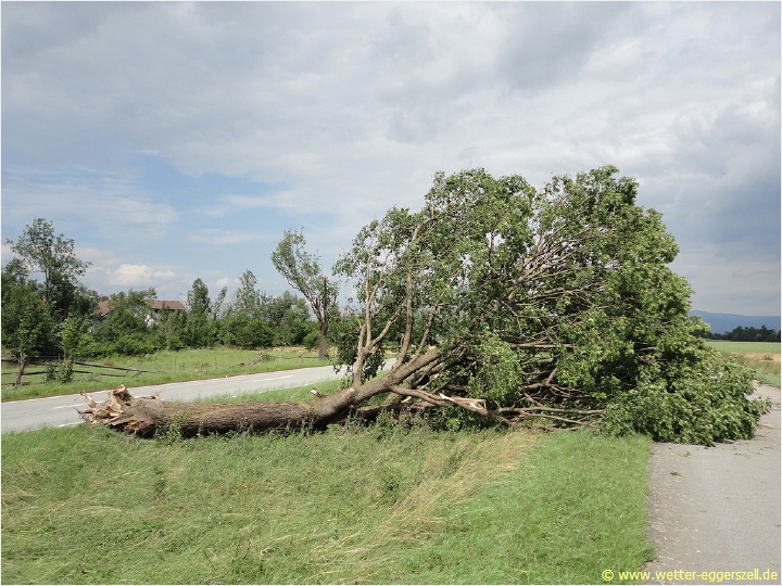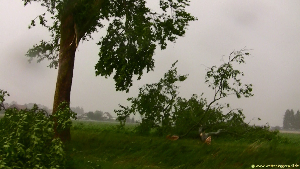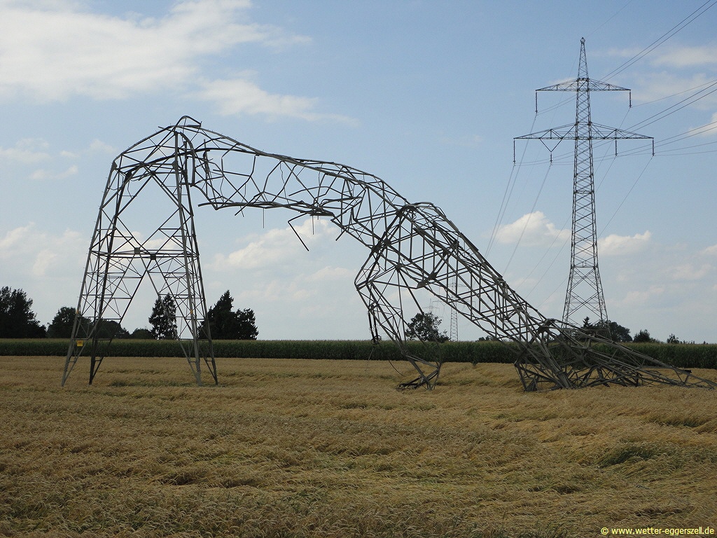 Bei Durchzug des Unwetters gab es zwischen Straubing und Deggendorf verbreitet sehr kräftigen Platzregen mit wenig Sicht, dazu gab es lokal heftige Fallböen weit über 120 km/h, welche sogar große Strommasten dem Erdboden gleichmachten: