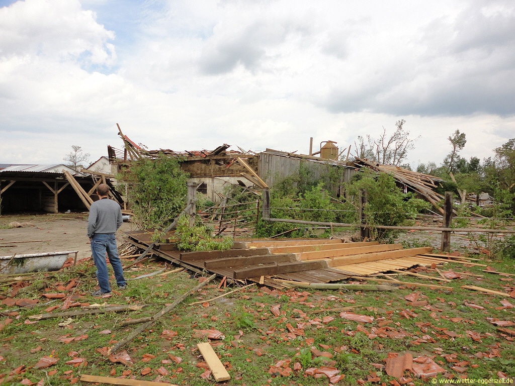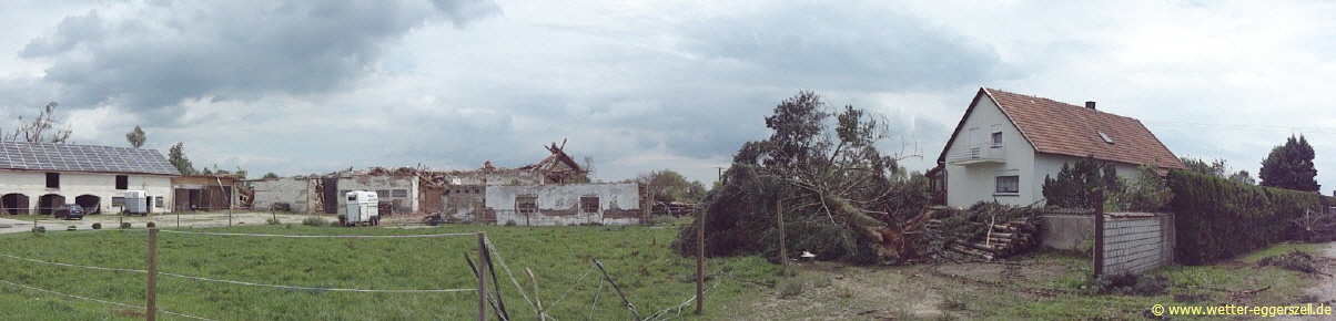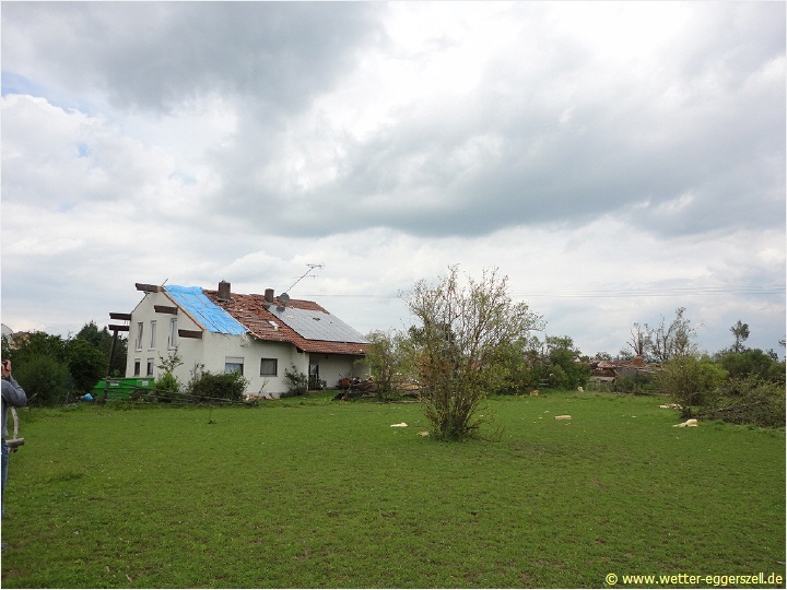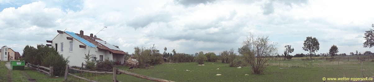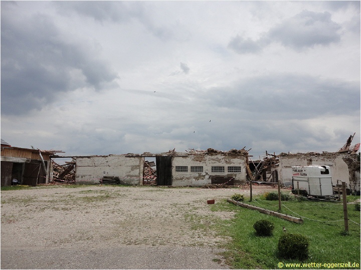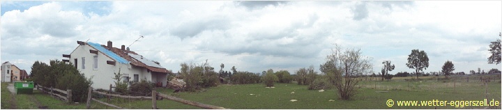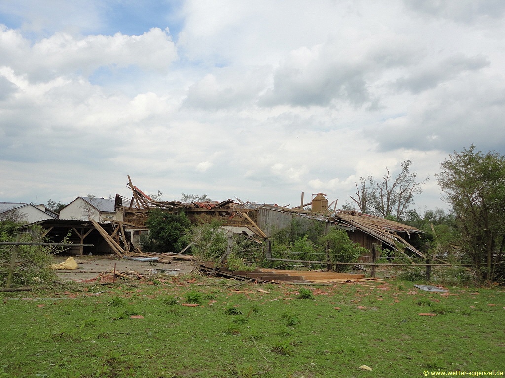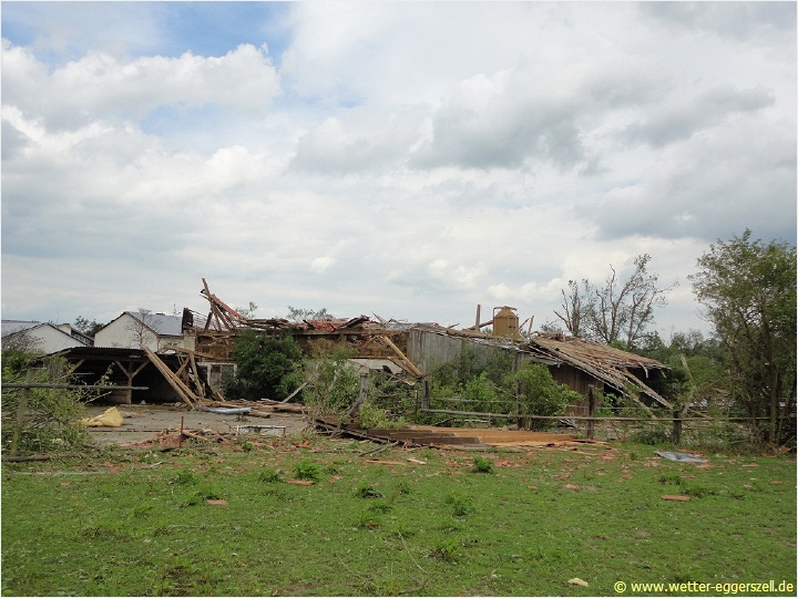 Diese Reithalle wurde von der Windhose komplett dem Erdboden gleichgemacht. Dieses Teil des Daches gehört zu dem Haus im oberen Bild. Das Dach wurde erst nach ca. 150 m wieder zu Boden geworfen. Aufgrund solch massiver Schäden, müssen im Tornadotrichter Windgeschwindigkeiten von weit über 120 km/h vorgeherrscht haben (F1 Tornado). Ob die Windhose örtlich (und kurz beschränkt) mit über 180 km/h gewütet hat (F2 Tornado), ist hinsichtlich der Schäden durchaus denkbar.