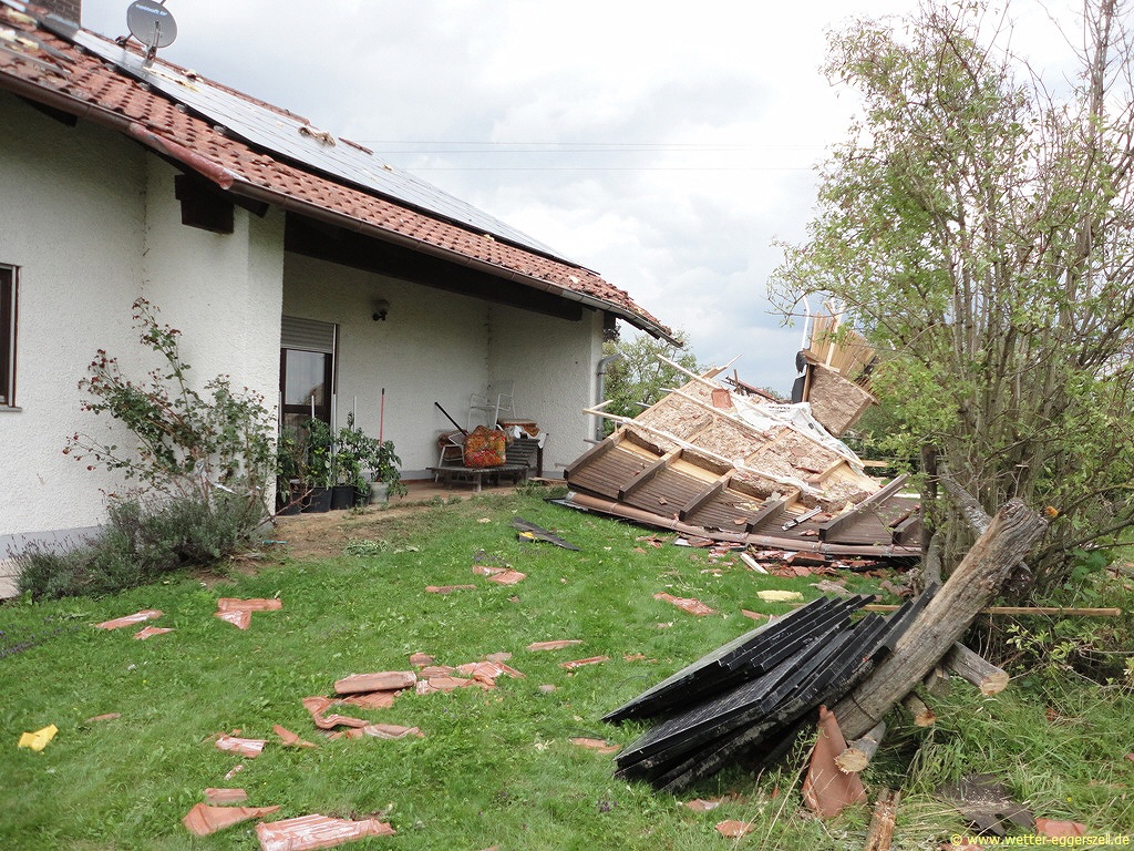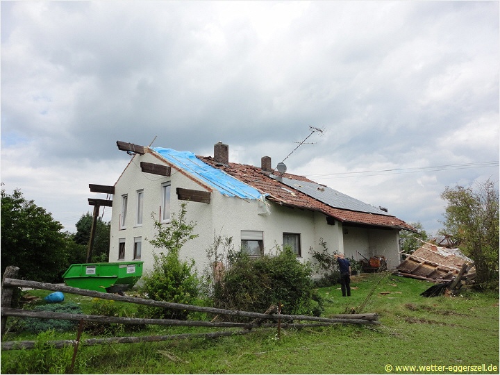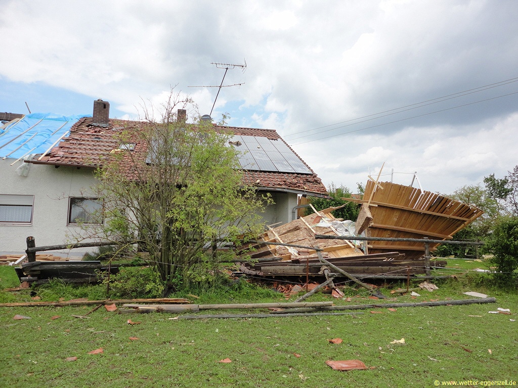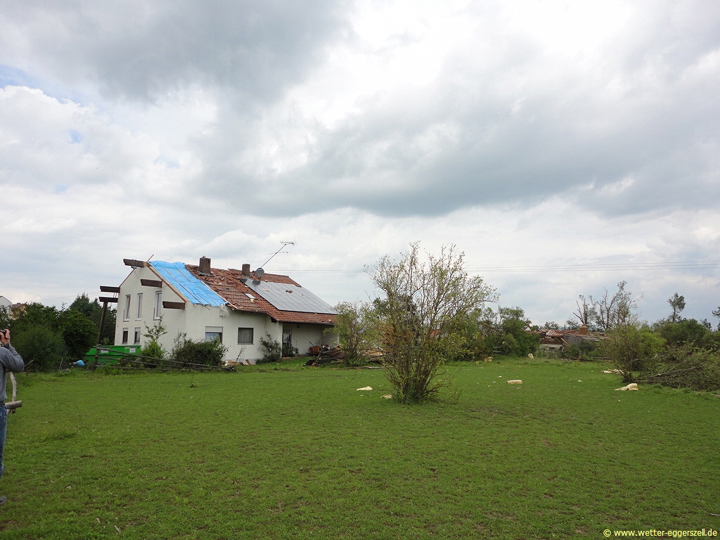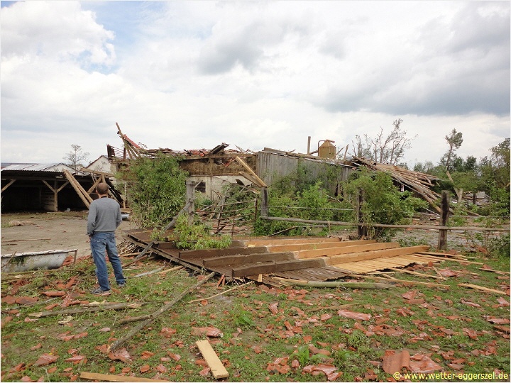 Diese Reithalle wurde von der Windhose komplett dem Erdboden gleichgemacht. Dieses Teil des Daches gehört zu dem Haus im oberen Bild. Das Dach wurde erst nach ca. 150 m wieder zu Boden geworfen. Aufgrund solch massiver Schäden, müssen im Tornadotrichter Windgeschwindigkeiten von weit über 120 km/h vorgeherrscht haben (F1 Tornado). Ob die Windhose örtlich (und kurz beschränkt) mit über 180 km/h gewütet hat (F2 Tornado), ist hinsichtlich der Schäden durchaus denkbar.
