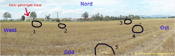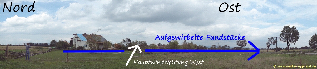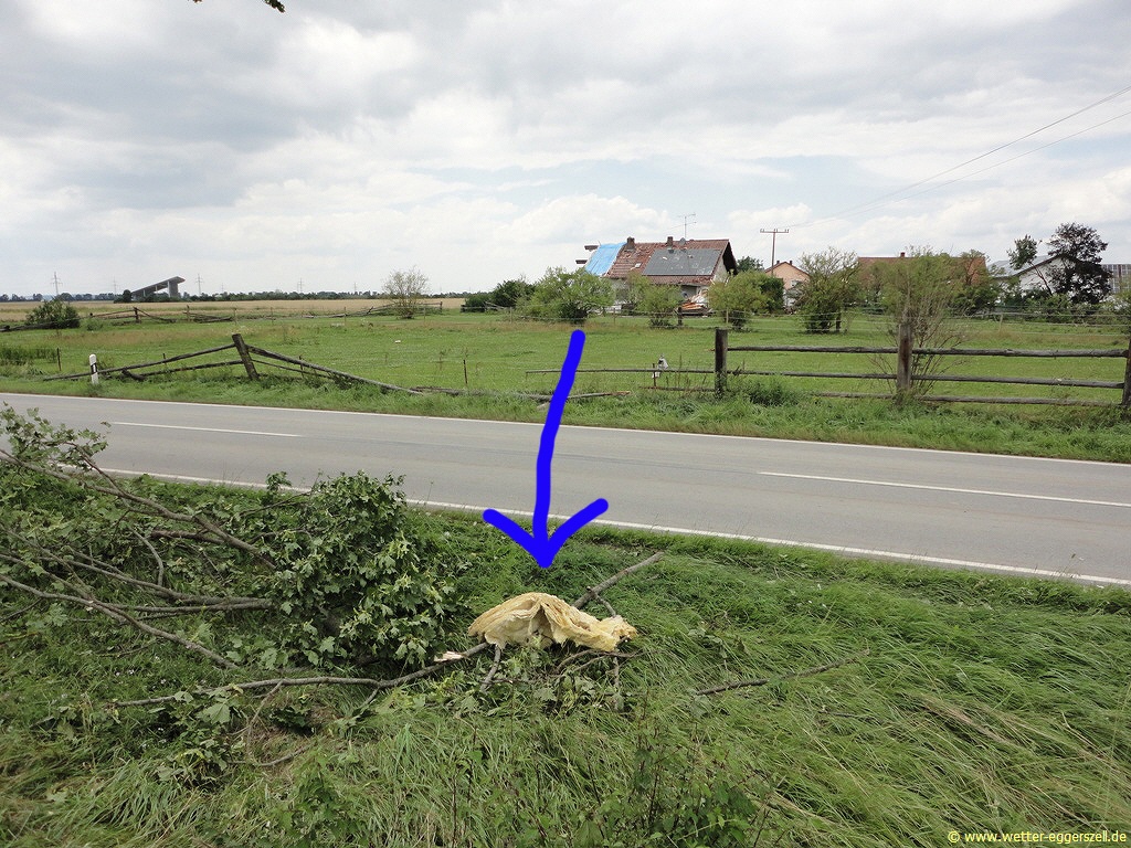 Hier im Panorama sieht man sehr deutlich, dass es sich hier nicht um einen Downburst gehandelt haben kann. Der Grund dafür sind Dachziegel und Reste von Isoliermatten, welche nach Abriss des Dachstuhl in die freie Luft gelangten und umher gewirbelt wurden. Während des Unwetter wehte verbreitet in der Region extrem starker Wind aus West bis Südwest (siehe z.B. erstere Bilder oben + Fotos vom umgestürtzten Strommasten). Dieser Wind hätte normalerweise bei dieser Windrichtung die Isoliermatten weit in die Mitte der Ortschaft in Richtung Nordosten wehen müssen. Die gelben Matten wurden allerdings in Richtung Süden geweht. Ich konnte sogar noch Isoliermatten ca. 600-700 m südlich des Hauses auffinden, welche eindeutig dem Haus zuzuordnen sind. Dies bedeutet, dass hier in Sautorn eine Windhose gewütet haben muss, denn selbst eine Tür im oberen Stockwerk dieses Hauses wurde weit nach Süden transportiert: