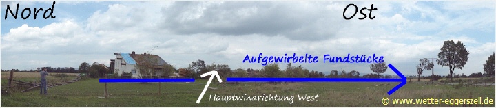 Nur ca. 100 m weiter westlich im Ort änderte sich die Situation nun drastisch: Plötzlich lagen alle Bäume nicht mehr in nordöstlicher Richtung am Boden, sondern beinahe 180 ° verdreht in Richtung Südwesten. Der Besitzer dieses Gartens zeigte mir in diesem Rasen Kieselsteine, welche aus dem inneren des Hofes in Richtung Südwesten in das Gras gewirbelt wurden. Als ich die Schäden in diesem Garten sah, legte sich meine anfängliche Skepsis hinsichtlich eines Tornadofalles sehr deutlich: