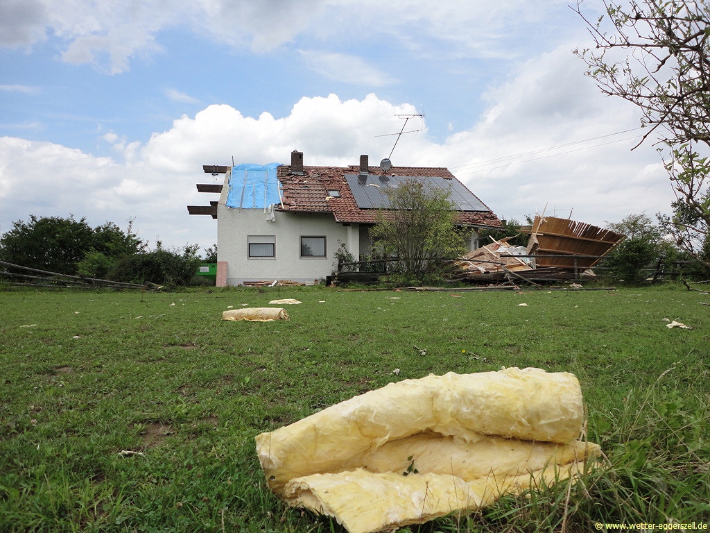 Hier sieht man es auch nochmals sehr schön: Das Foto wurde aus südwestlicher Richtung aufgenommen. Die Isoliermatten aus dem Dachstuhl sind in Richtung Süden anstatt nach Nordosten gewirbelt worden. Siehe auch den verbogenen Antennenmast auf dem Hausdach, welcher ebenfalls in Richtung Süden zeigt: