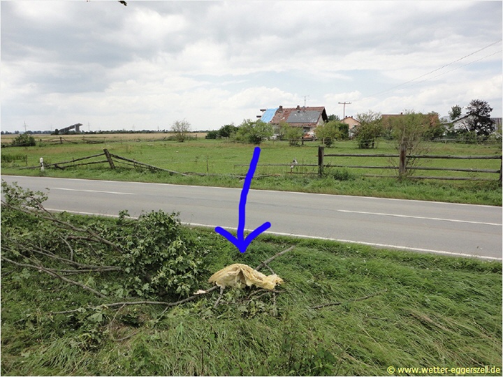 Das absolute Beweisfoto konnte ich schließlich ca. 300 m südlich von Sautorn knipsen! Ich fand dort wieder überall Fetzen der Isoliermatten von diesem einem gesagten Haus. Dieses Haus ist übrigens auch nördlich der Isoliermatten auf dem Foto zu sehen. Der Tornaod muss zunächst den Dachstuhl abgerissen haben und anschließend wirbelte er die dazugehörigen Isoliermatten weit nach oben und fielen letzten Endes hier auf diesem Feld wieder zu Boden: