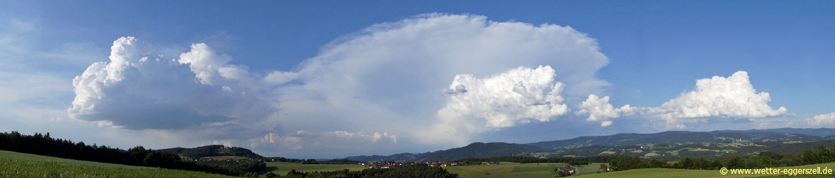 Einen Schwerpunkt der gewittrigen Zellen gab es im südlichen Landkreis Cham zwischen Hohenbogen und Tschechischer Grenze. Hier hielten sich für längere Zeit kräftige konvektive Niederschläge in Form von heftigen Platzregen und vereinzeltem Hagelschlag. Ich beobachtete die Gewitterschauer aus südlicher Richtung bei Eggerszell und Riederszell, dabei entstand folgendes Panoramabild von Riederszell in Richtung Nordosten: