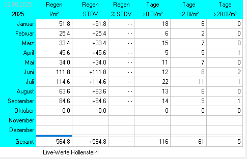 Hier finden Sie eine ausführliche Auflistung der Jahres-Wetterdaten 2025 von der Privaten Wetterstation Höllenstein (Kraftwerk).